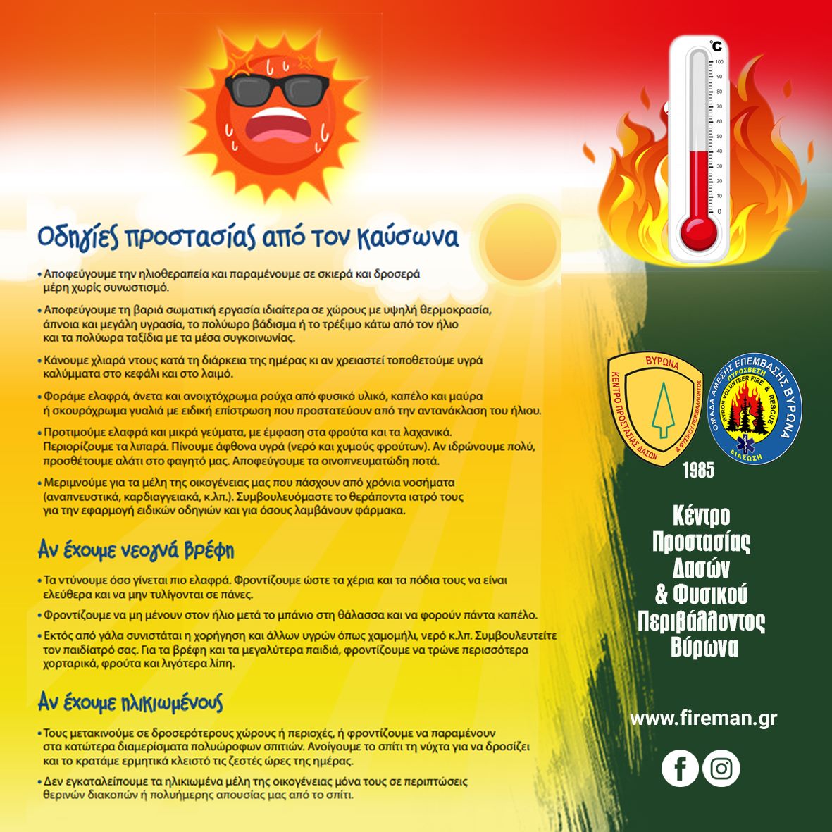 Το Κέντρο Προστασίας Δασών & Φυσικού Περιβάλλοντος Βύρωνα στα πλαίσια της ενημέρωσης των πολιτών δημιούργησε οδηγίες προστασίας του καύσωνα. Σήμερα θα είναι η ποιο δύσκολη μέρα επομένως πρέπει να προσέχουμε. #kpdfp #oae #kausonas2021