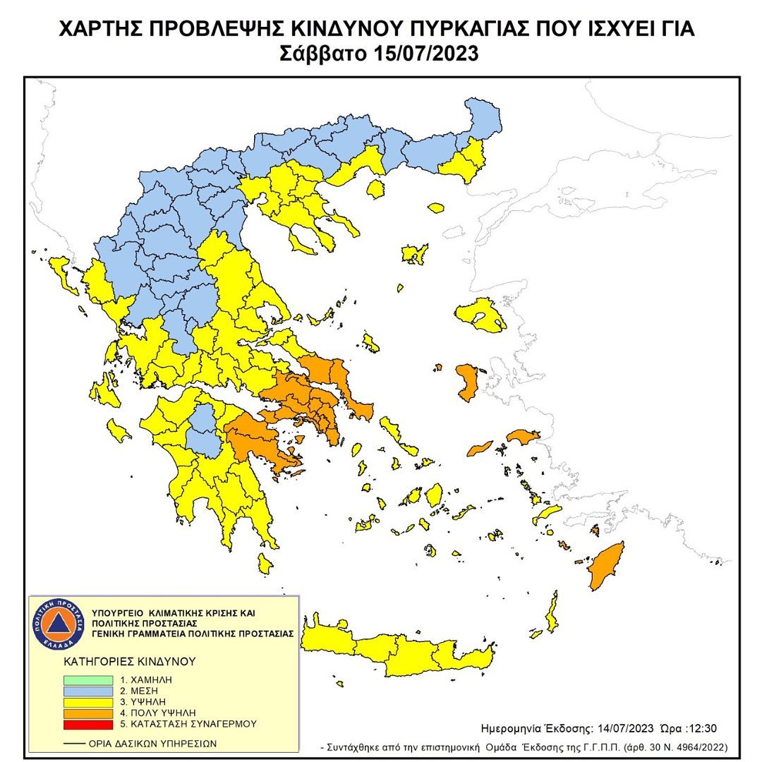 Σας ενημερώνουμε για την πρόγνωση με δείκτη επικινδυνότητας εκδήλωσης πυρκαγιάς που αναμένεται για αύριο Σάββατο 15-07-2023.