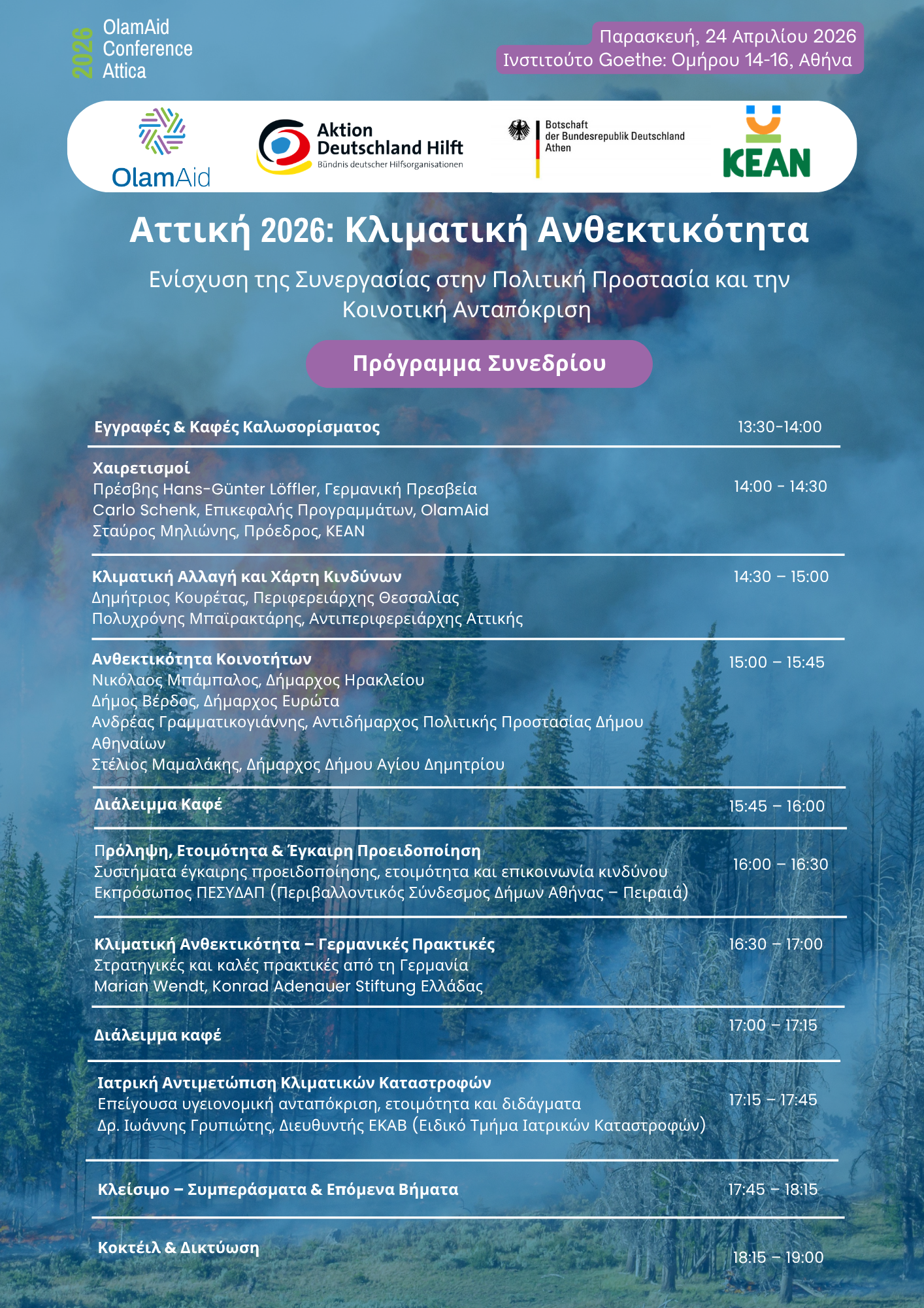 Το Κέντρο Προστασίας Δασών και Φυσικού Περιβάλλοντος Βύρωνα συμμετείχε ενεργά στο συνέδριο με τίτλο «Ανθεκτικότητα στην Κλιματική Αλλαγή στην Αττική 2026», το οποίο διοργανώθηκε από το KEAN, την OlamAid και τη Γερμανική Πρεσβεία στην Αθήνα, στις 24 Απριλίου 2026, στο Goethe-Institut Athen.